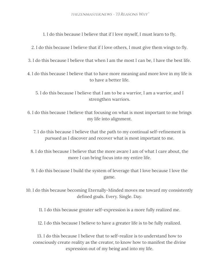 This was the 13 Reasons I selected in its earliest published format, alongside 20 reasons and a more extensive reason list I would work with later.